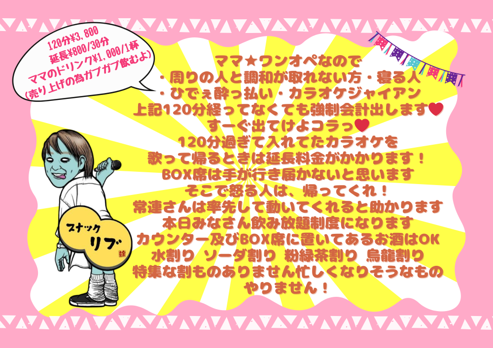 | 飲み放題 歌い放題 90分 (金土祝60分) ¥3,800- | 飲み歌い放題90分 ¥3,800 延長¥1,000/30分 レモンサワー ハイボール タコハイボール ママ汁サワー 焼酎 ウイスキー ブランデー |